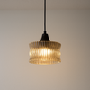 Design minimalista em destaque: o pendente Myrina combina vidro texturizado translúcido e cúpula ondulada com estrutura em alumínio preto fosco, revelando um estilo moderno-contemporâneo. Disponível em acabamento âmbar ou fumê, ele realça a iluminação com difusão suave e toque elegante. Ideal para ambientes clean e atuais.