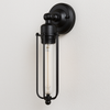 Iluminação decorativa para criar ambientação e dar presença visual à parede com um visual industrial limpo.